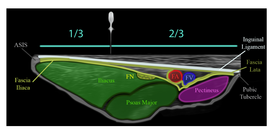 The femoral nerve lies in a compartment bounded anteriorly by the fascia of the iliacus muscle. It can be accessed rapidly using a landmark-based technique