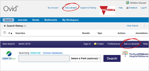 If you've already started searching in an Ovid or Ebsco database and encounter difficulties, use the Ask a Librarian feature within the search interface.