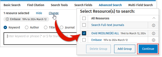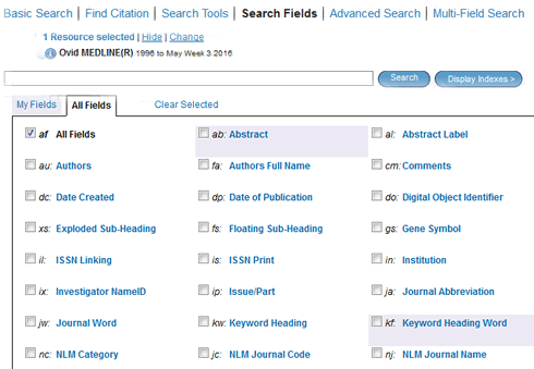 Limiting your keyword search to certain fields is an effective method for reducing search results. First, find the field code (abbreviation) supported by the database. In Ovid, you'll find this in the Search Fields tab (located above