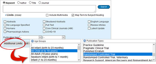 Most databases have a limit for Age Groups, such as All Child (0-18), available from the Additional Limits option. In most situations this is sufficient in reducing the search results to that particular age group.
