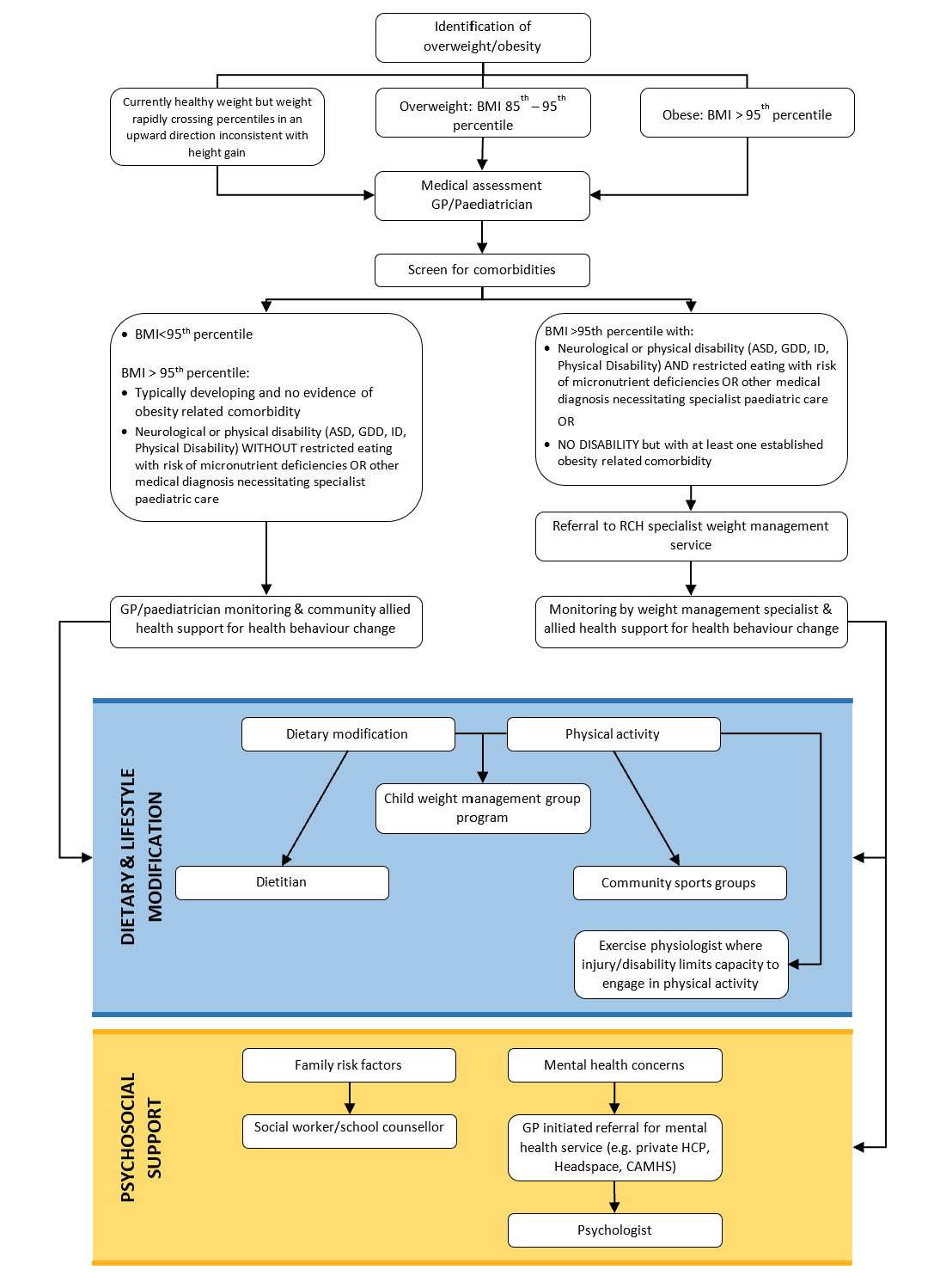 As with many hospital-based services there may be a waiting period to see the RCH Complex Clinical Obesity Assessment Service. GP/Paediatrician management of obesity with the support of community/primary care allied health clinicians should continue until a referral to the RCH Complex Clinical Obesity Assessment Service has been accepted and the child has been assessed by the Complex Clinical Obesity Assessment Service team to decide whether the child should continue with primary or tertiary care management.